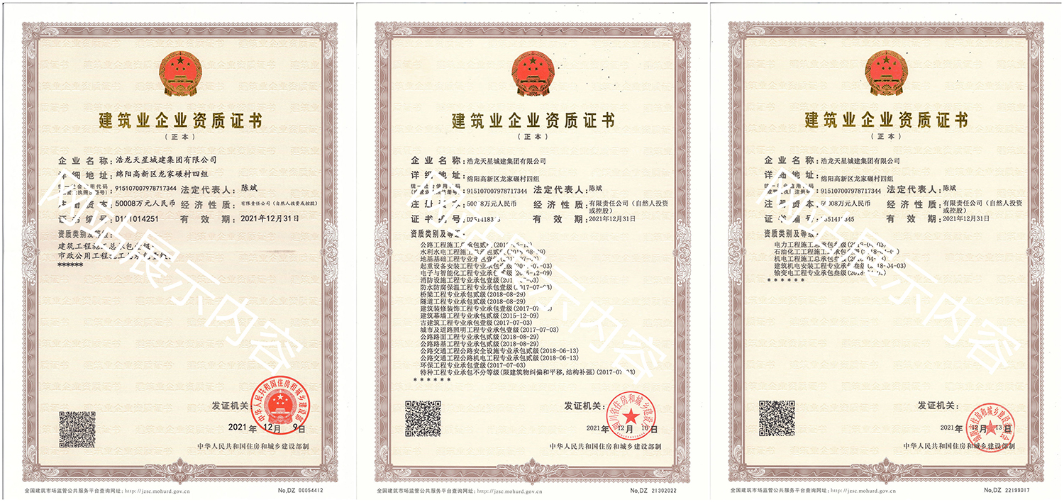 浩龍?zhí)煨浅墙瘓F有限公司,2007年成立于“李白故鄉、中國科技城”—四川省綿陽市,企業注冊資本金5.0008億元。公司共有27項建筑業企業資質,其中國家一級資質11項,二級資質10項,三級資質5項,特種資質不分等級1項,類別涵蓋建筑、市政、水利、機電、隧道、起重設備安裝等基礎及未來發(fā)展重點專業。公司下設三個辦事處,業務范圍輻射全國,在建項目三十余個,累計完成產值超11億元。公司是綿陽市建筑施工企業協會副會長單位、綿陽遂寧商會會長級單位、綿陽首批建筑業綠卡企業,在綿陽本地企業中綜合實力名列前茅。